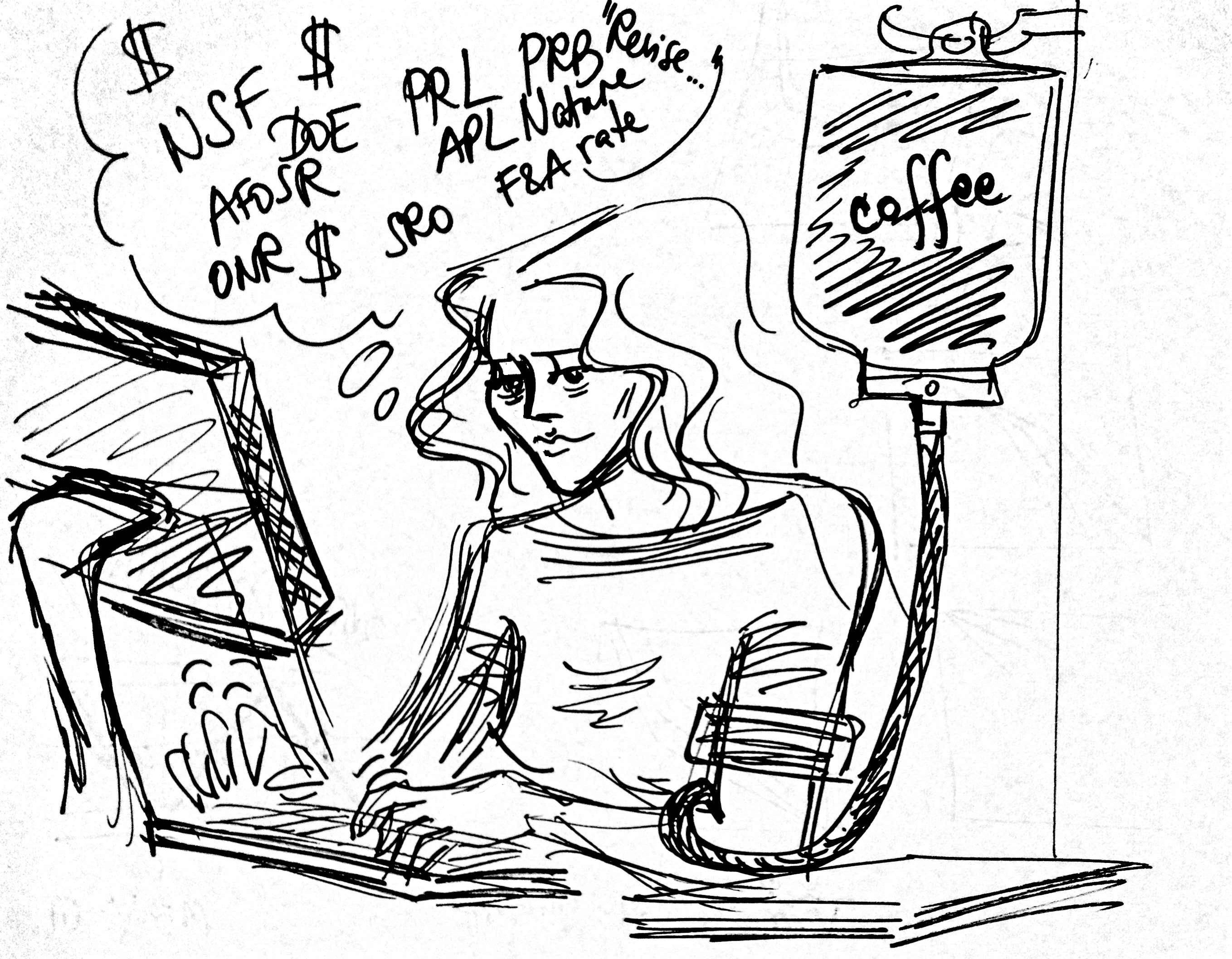 For nonacademic readers: NSF, DOE, AFOSR, and ONR are federal funding agencies that fund research in the physical sciences (NSF also funds biological and social sciences). SPO stands for Sponsored Programs Office, the university staff that work on grant administration. The F&A rate is the so-called overhead rate and is anywhere between 40 and 70%, depending on the institution. It means that on top of every dollar you request for research, you need to request an additional 40 to 70 cents, which go directly to the university in order for it to help you do research (at least in theory). PRL, PRB, APL are reputable journals in the physical sciences (PRL is very prestigious and publishes papers across all physics). Nature is a high-profile magazine that publishes research across all fields of science.