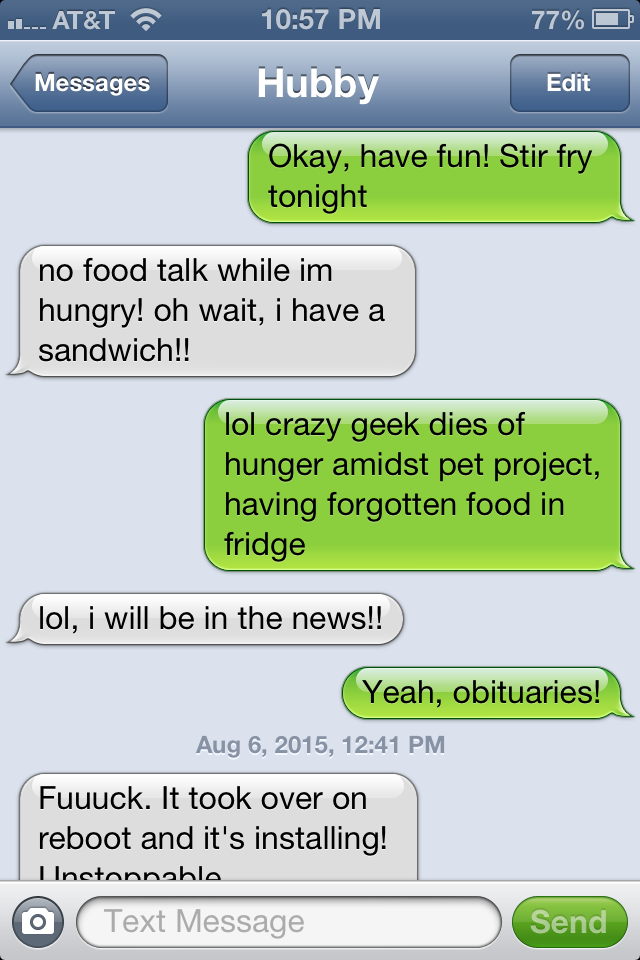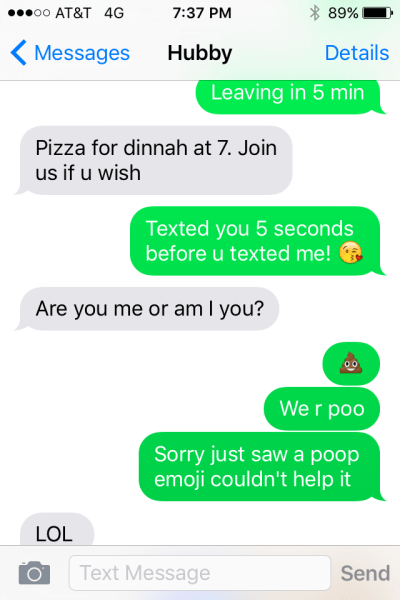 My husband (DH) and I don’t communicate much during the work day, and when we do it’s usually via text messages. Mostly we discuss child pickup or dinner plans, but it can often turn hilarious. Fair warning: Considering that we spend a lot of time around small children, it’s not a particularly highbrow kind of hilarity. Here are a few snippets; expect some swearing and typos.