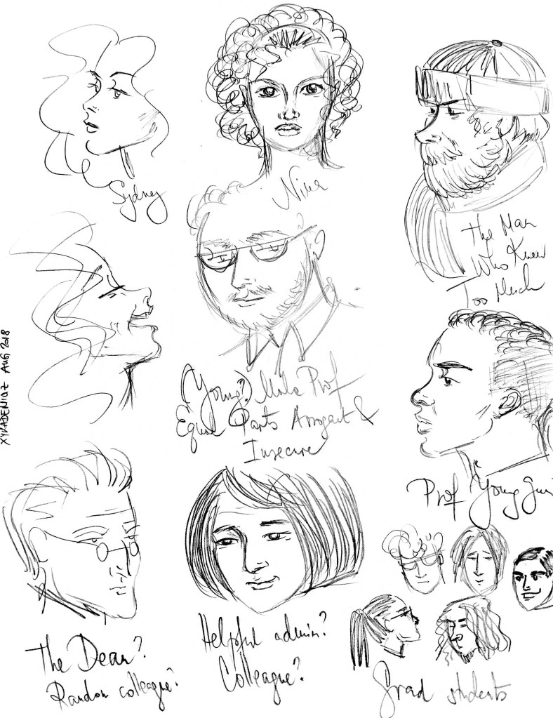 Here are some character sketches, in pencil. Some of these will make their way into the comic.