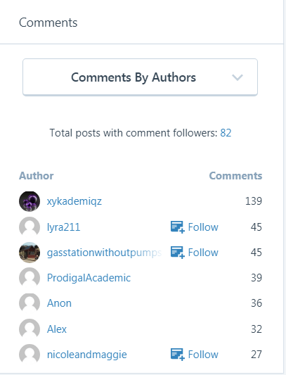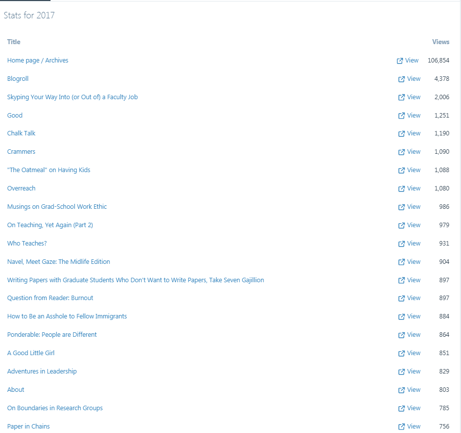 As for top commenters, that’s a bit tougher to extract now that WordPress doesn’t do the end-of-year summaries for us, but this is close enough (I did a manual count for the top commenters and the actual comment numbers in the year are a bit higher than what’s given below, but not by much). Thanks everyone for reading and commenting, and the top three commenters — lyra211, gasstationwithoutpumps, & Prodigal Academic — will be getting some Amazon gift cards via email!