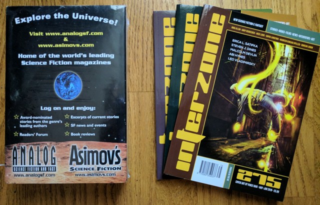 Science fiction magazines: I love Interzone and have received sample packs of Analog and Asimov’s. In case it’s not obvious, I am partial to science fiction over (many, perhaps most subgenres of) fantasy.